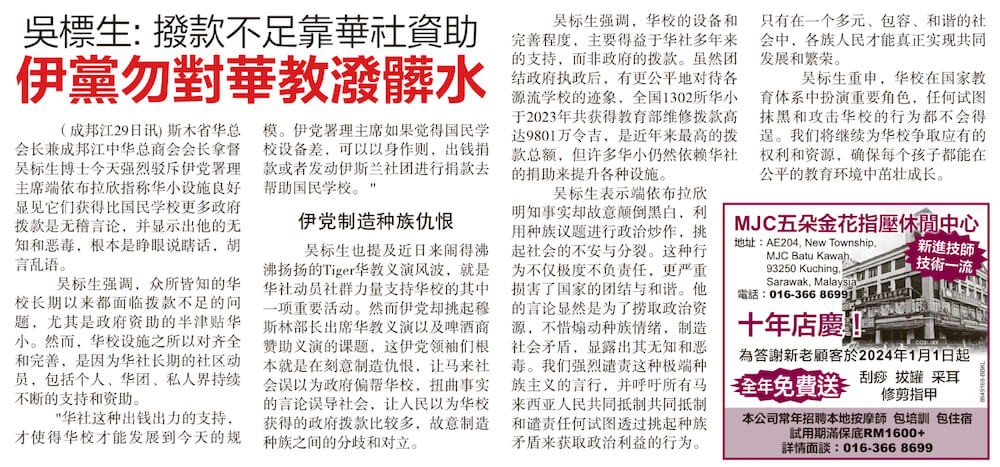 最后,吴标生重申,华校在国家教育体系中扮演着重要角色,任何试图抹黑和攻击华校的行为都不会得逞。我们将继续为华校争取应有的权利和资源,确保每一个孩子都能在公平的教育环境中茁壮成长。