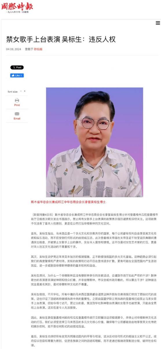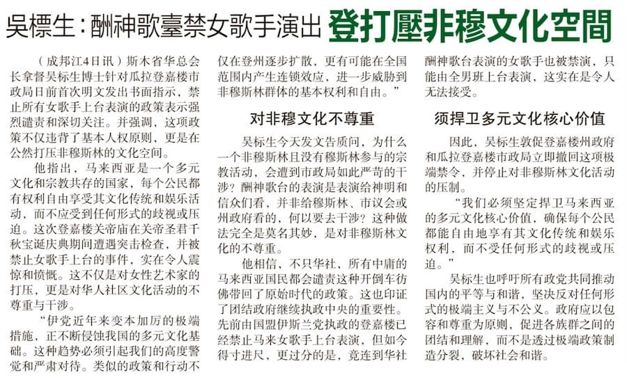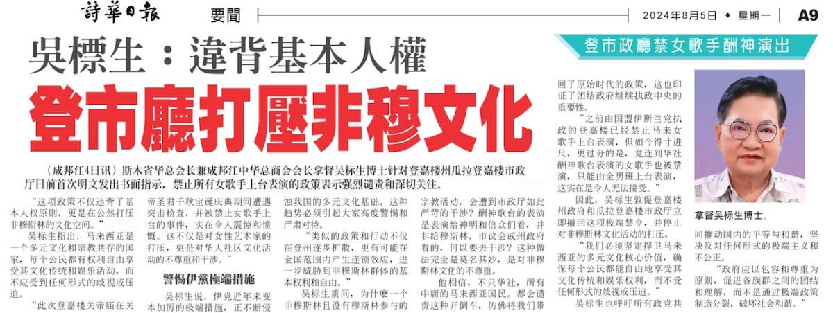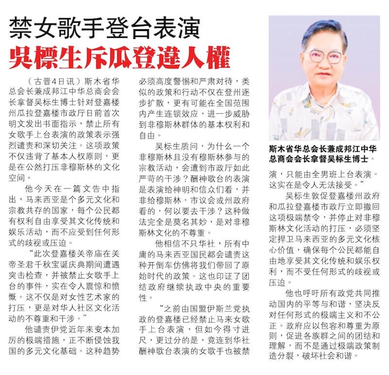 斯木省华总会长兼成邦江中华总商会会长拿督吴标生博士针对登嘉楼州瓜拉登嘉楼市政厅首次明文发出书面指示,禁止所有女歌手上台表演的政策表示强烈谴责和深切关注。这项政策不仅违背了基本人权原则,更是在公然打压非穆斯林的文化空间。