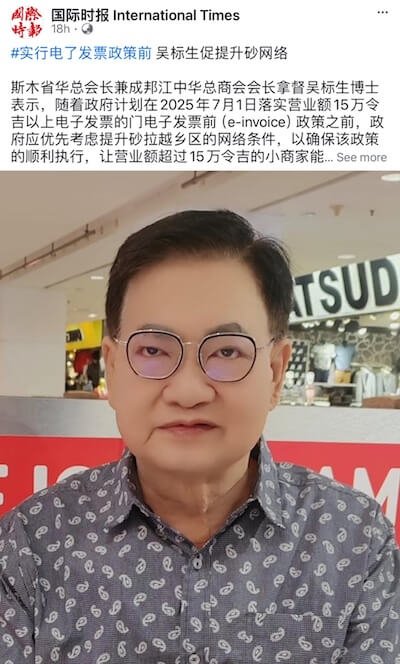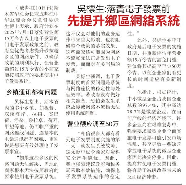 斯木省华总会长兼成邦江中华总商会会长拿督吴标生博士表示,随着政府计划在2025年7月1日全面落实电子发票(E-Invoice)政策,政府应优先考虑提升砂拉越乡区的网络条件,以确保该政策的顺利执行,让营业额超过15万令吉到50万令吉的小商家按照政府的要求使用电子发票系统。