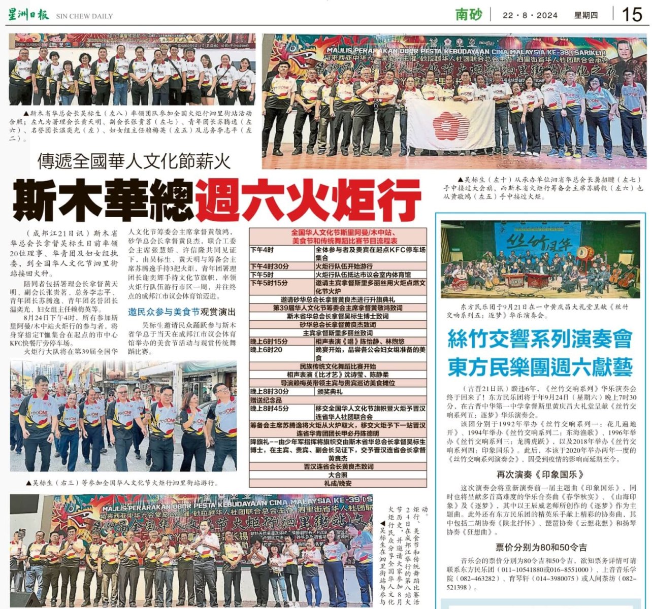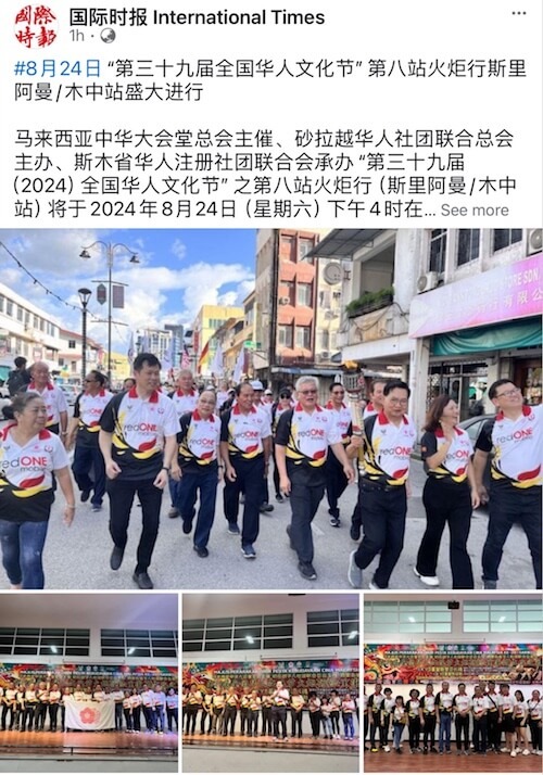 马来西亚中华大会堂总会主催、砂拉越华人社团联合总会主办、斯木省华人注册社团联合会承办的“第三十九届(2024)全国华人文化节”之第八站火炬行(斯里阿曼/木中站)将于2024年8月24日(星期六)下午4时在成邦江旧戏院旁边KFC停车场盛大举行。