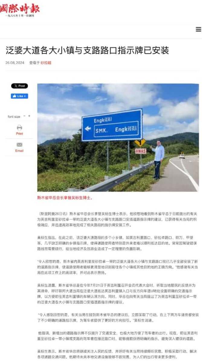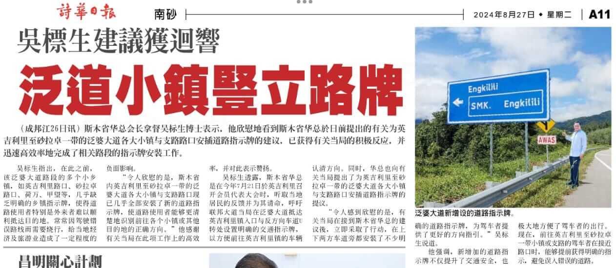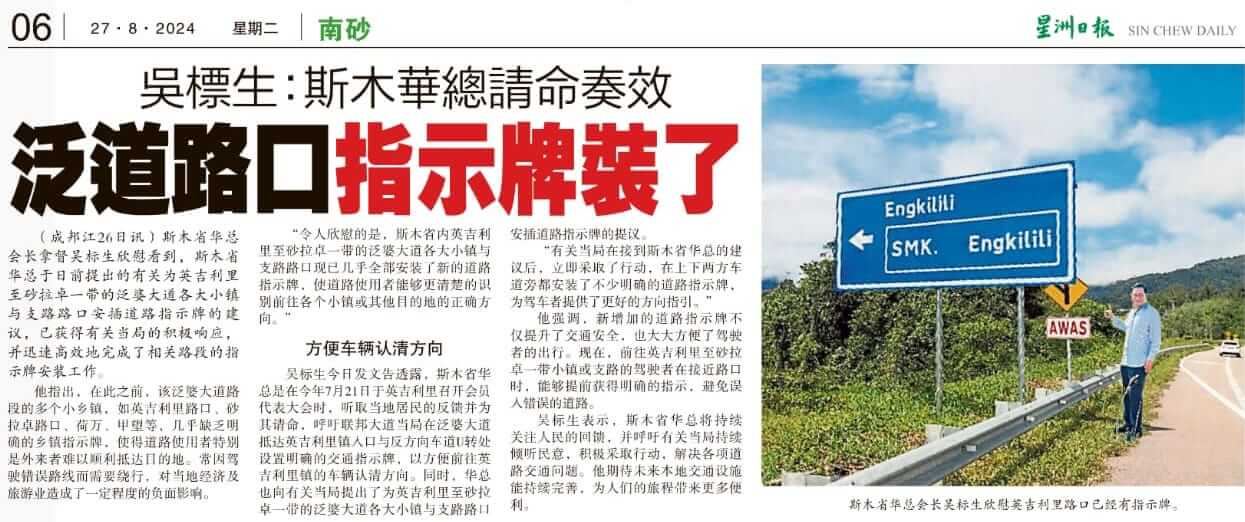 斯木省华总会长拿督吴标生博士表示,他欣慰地看到斯木省华总于日前提出的有关为英吉利里至砂拉卓一带的泛婆大道各大小镇与支路路口安插道路指示牌的建议,已获得有关当局的积极响应,并迅速高效率地完成了相关路段的指示牌安装工作。