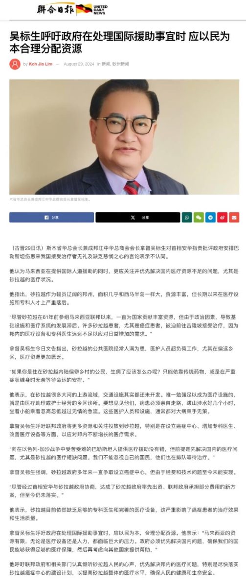 吴标生呼吁政府在处理国际援助事宜时,应以民为本,合理分配资源。他表示:“马来西亚的资源有限,无论是医疗设备还是人力,都面临巨大的压力。政府必须优先解决国内问题,确保我们的国民能够获得足够的医疗保障,然后再考虑向其他国家提供帮助。”