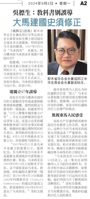 “马来西亚于1963年9月16日成立,这一事实应该明确列入大马的历史教科书,并在学校中加以正确教育。如果我们不在政府学校的教科书中教导我们的孩子们这些历史真相,他们将因为不了解真相而误解我们。”吴标生强调。