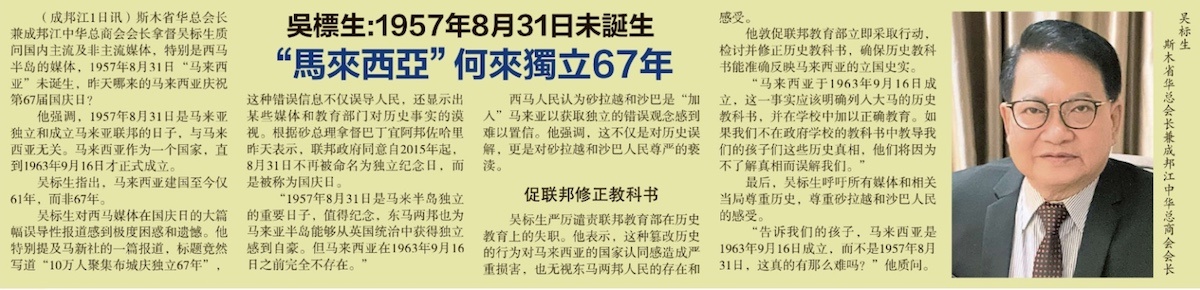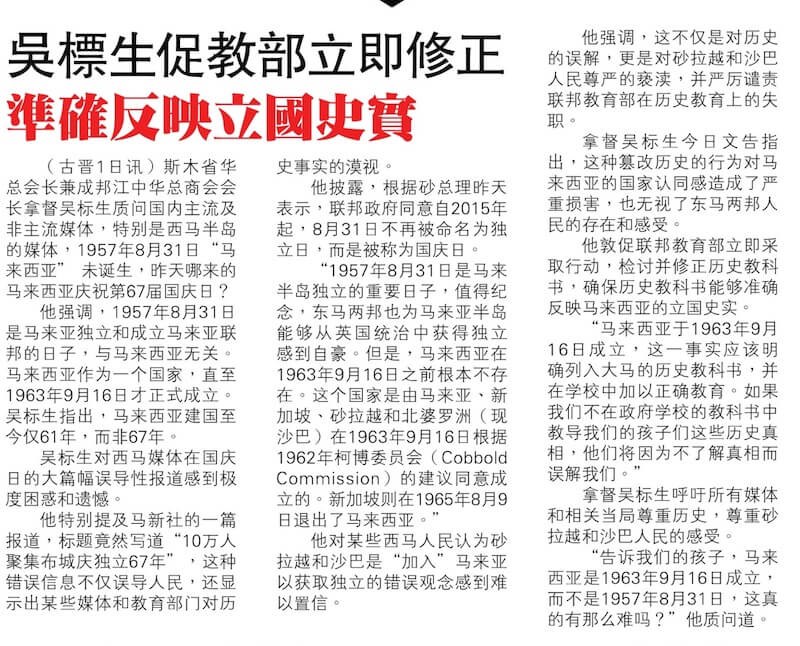 “1957年8月31日是马来半岛独立的重要日子,值得纪念,东马两邦也为马来亚半岛能够从英国统治中获得独立感到自豪。但是,马来西亚在1963年9月16日之前根本不存在。这个国家是由马来亚、新加坡、砂拉越和北婆罗洲(现沙巴)在1963年9月16日根据1962年柯博委员会(Cobbold Commission)的建议同意成立的。新加坡则在1965年8月9日退出了马来西亚。”吴标生指出。