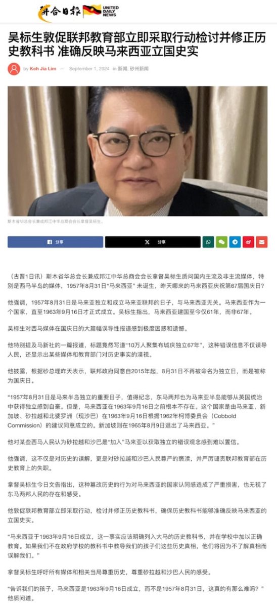 吴标生对西马媒体在国庆日的大篇幅误导性报道感到极度困惑和遗憾。他特别提及马新社的一篇报道,标题竟然写道“10万人聚集布城庆独立67年”,并认为这种错误信息不仅误导人民,还显示出某些媒体和教育部门对历史事实的漠视。根据砂拉越总理阿邦佐昨天表示,联邦政府同意自2015年起,8月31日不再被命名为独立日,而是被称为国庆日。