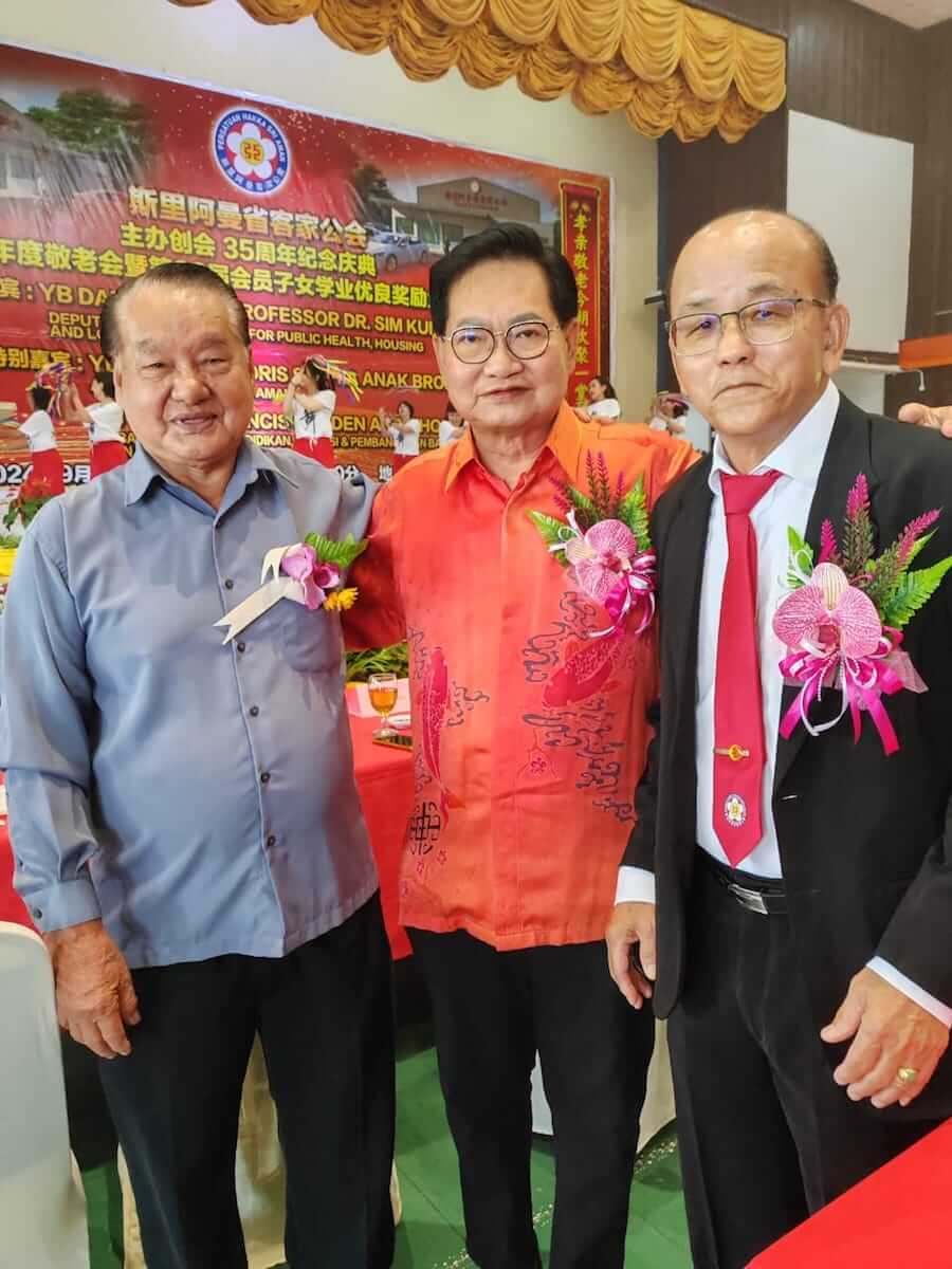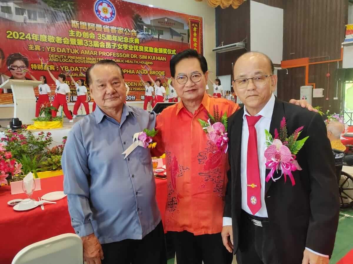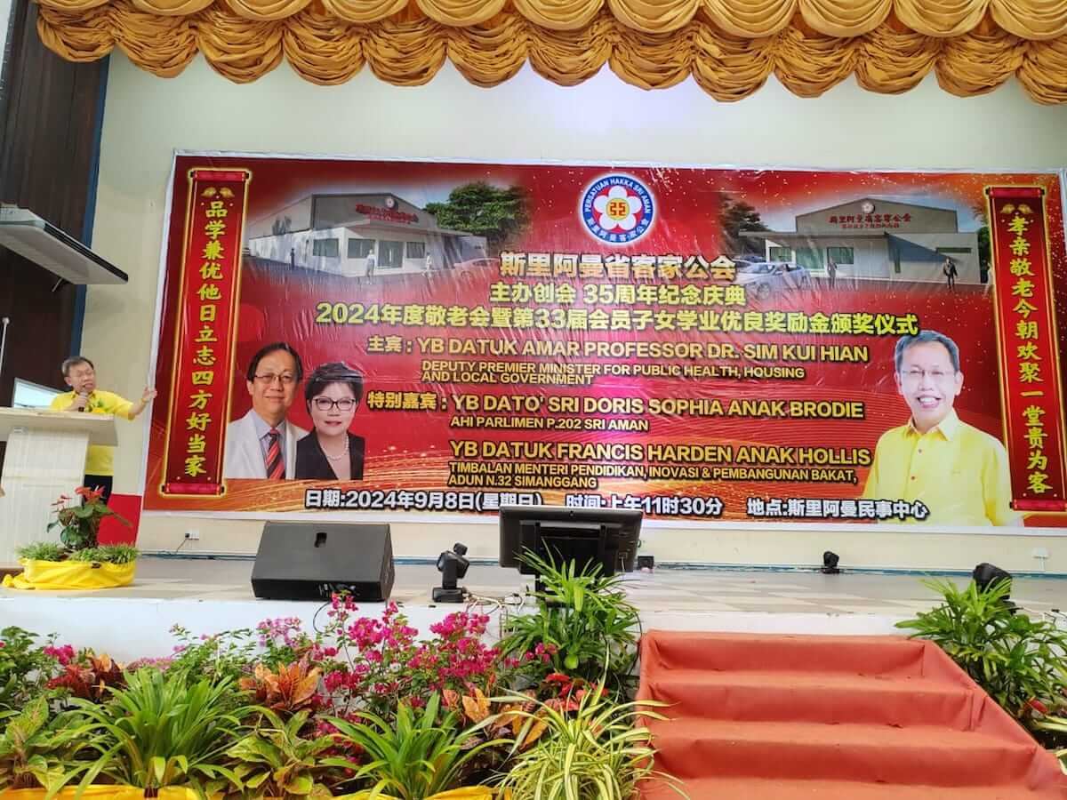 斯里阿曼省客家公会今早在斯里阿曼民事中心举办创会35年庆典午宴暨2024年度敬老会与颁发该会第33届会员子女教育奖励金,邀请砂副总理兼公共卫生、房屋及地方政府部长拿督阿玛沈桂贤为主宾。庆典特别嘉宾包括斯里阿曼区国会议员拿督斯里多丽丝,斯木省华总会长拿督吴标生博士以及来自全砂各地客联的代表们,场面盛况热闹。今年度奖励金赞助人为该会名誉顾问刘国锋,敬老会赞助人为该会名誉顾问赖汉锦。