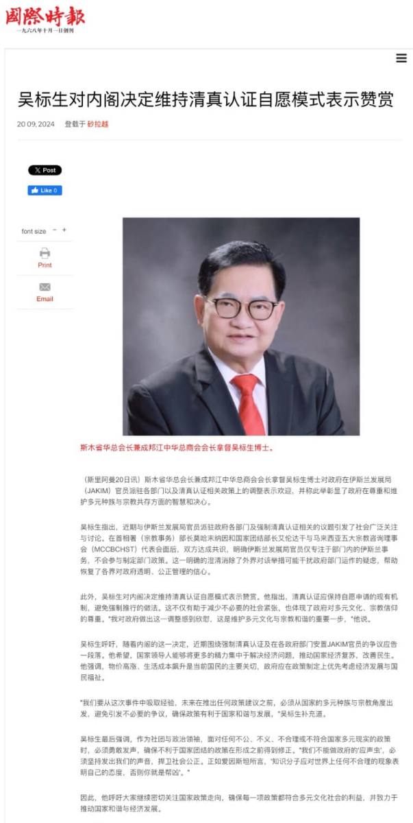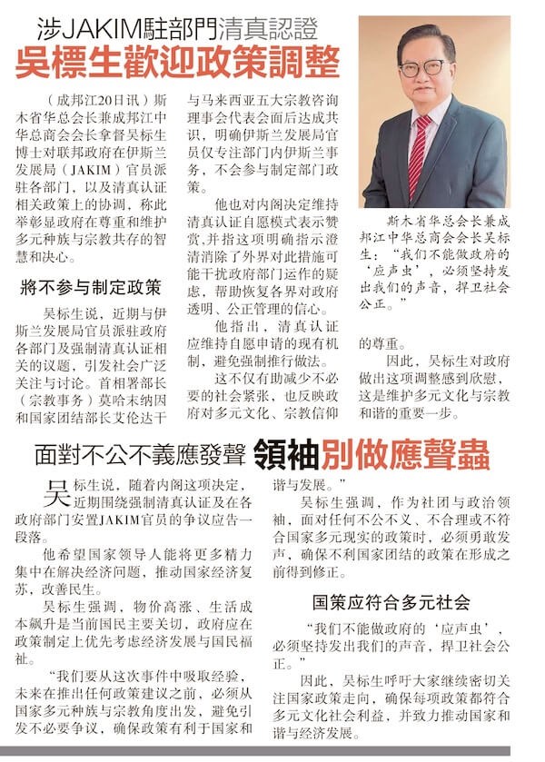 斯木省华总会长兼成邦江中华总商会会长拿督吴标生博士对政府在伊斯兰发展局(JAKIM)官员派驻各部门以及清真认证相关政策上的调整表示欢迎,并称此举彰显了政府在尊重和维护多元种族与宗教共存方面的智慧和决心。
