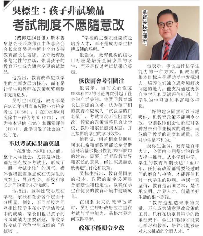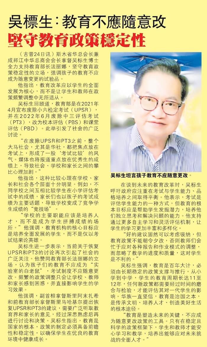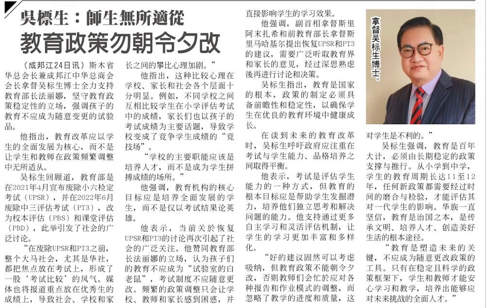 吴标生强调,教育是百年大计,必须由长期稳定的政策支撑与推行。从小学到中学,学生的教育周期长达11至12年,任何新政策都需要经过时间的磨合与检验,才能评估其对一代学生的影响。华族一直坚信,教育是治国之本,是传承文明、培养人才、创造美好生活的根本途径。