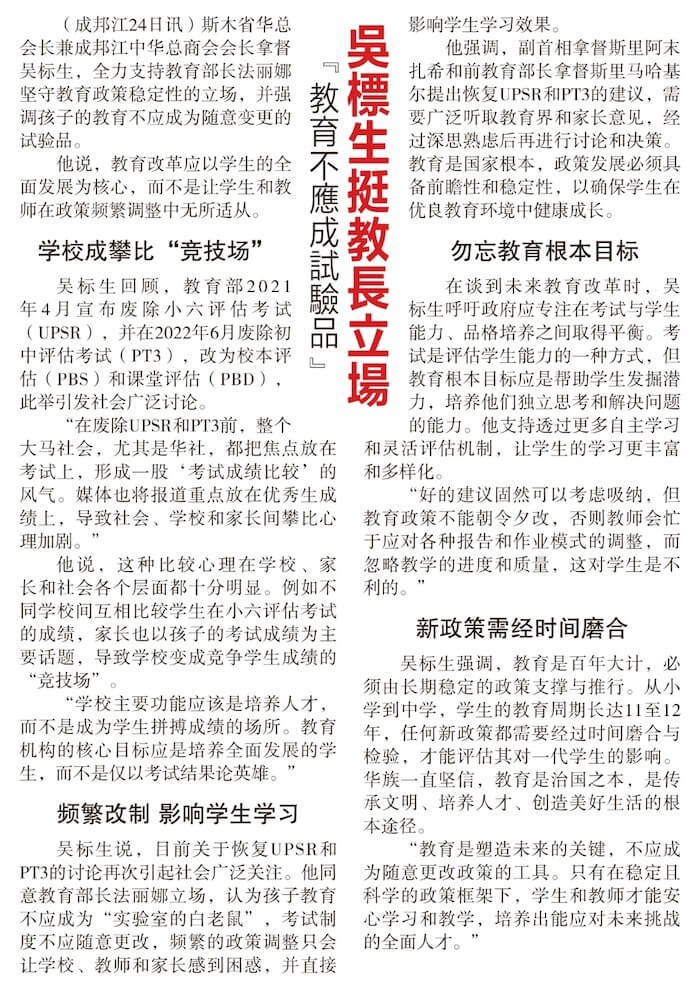 吴标生回顾道,教育部是在2021年4月宣布废除小六检定考试(UPSR),并在2022年6月废除中三评估考试(PT3),改为校本评估(PBS)和课堂评估(PBD),此举引发了社会的广泛讨论。