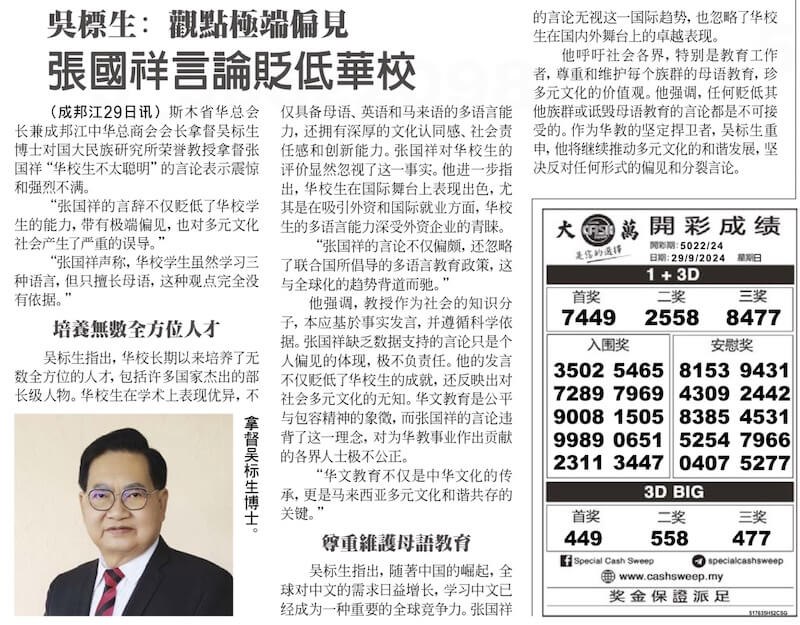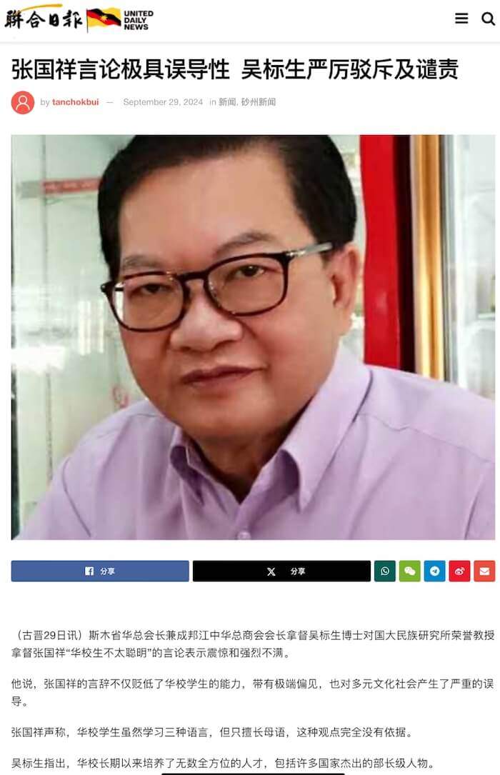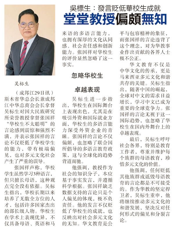 29/09/24 拿督吴标生严厉驳斥张国祥“华校生不聪明”论
