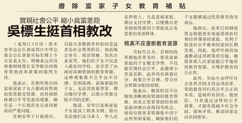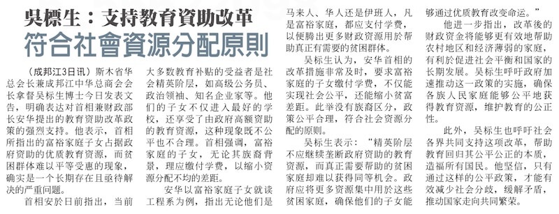 斯木省华总会长兼成邦江中华总商会会长拿督吴标生博士今日发表文告,明确表达对首相兼财政部长安华提出的教育资助改革政策的强烈支持。他表示,首相所指出的富裕家庭子女占据政府资助的优质教育资源,而贫困群体难以平等受惠的现象,确实是一个长期存在且亟待解决的严重问题。