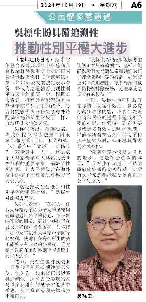 斯木省华总会长兼成邦江中华总商会会长拿督吴标生博士对昨日国会通过政府修订《联邦宪法》第14(1)(b)条文的决定表示赞赏,并认为这是朝着实现性别平权迈出的重要一步。根据此次修订,拥有外籍配偶的大马籍母亲在海外所生的孩子,今后将能够像大马籍父亲与外籍配偶在海外所生的孩子一样,自动获得大马公民权。