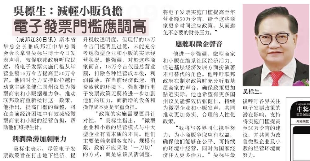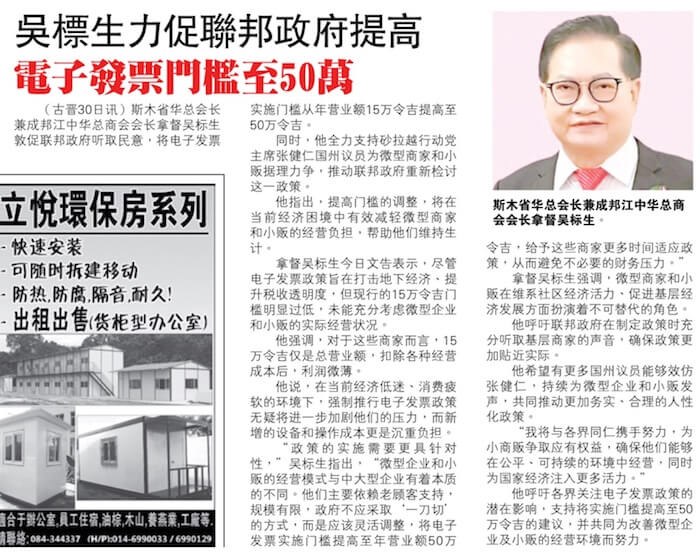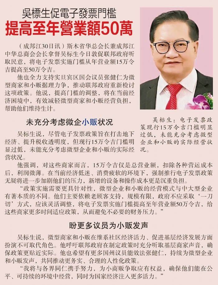 斯木省华总会长兼成邦江中华总商会会长拿督吴标生敦促联邦政府听取民意,将电子发票实施门槛从年营业额15万令吉提高至50万令吉。