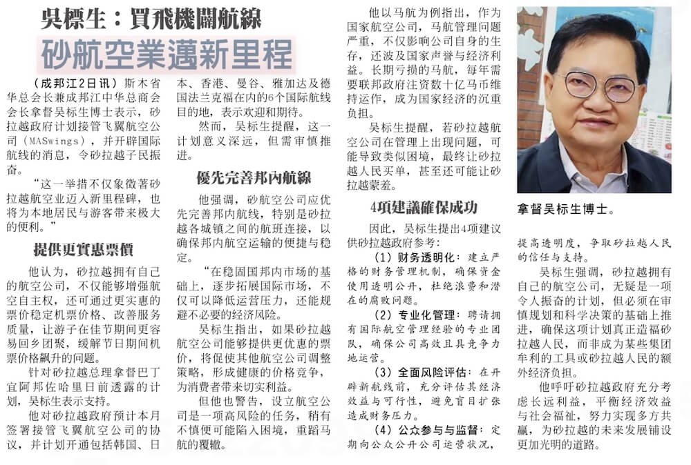 吴标生最后强调,砂拉越拥有自己的航空公司无疑是一项令人振奋的计划,但必须在审慎规划和科学决策的基础上推进,确保这项计划真正造福砂拉越人民,而非成为某些集团牟利的工具或砂拉越人民的额外经济负担。他呼吁砂拉越政府充分考虑长远利益,平衡经济效益与社会福祉,努力实现多方共赢,为砂拉越的未来发展铺设更加光明的道路。