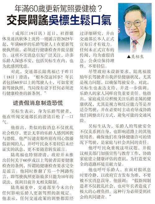 近日,社交媒体及通讯软件上流传一则谣言,称自2025年起,年满60岁或以上的乐龄驾驶人士在更新驾驶执照前,必须进行健康检查并提呈报告。这一不实消息引发广泛关注,许多乐龄人士深感不安,包括吴标生在内,也为此感到忧虑。