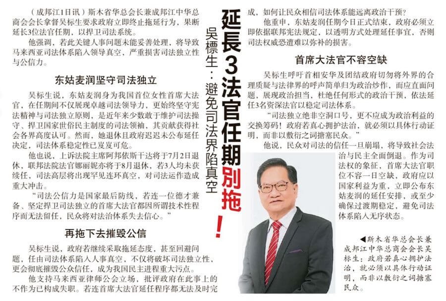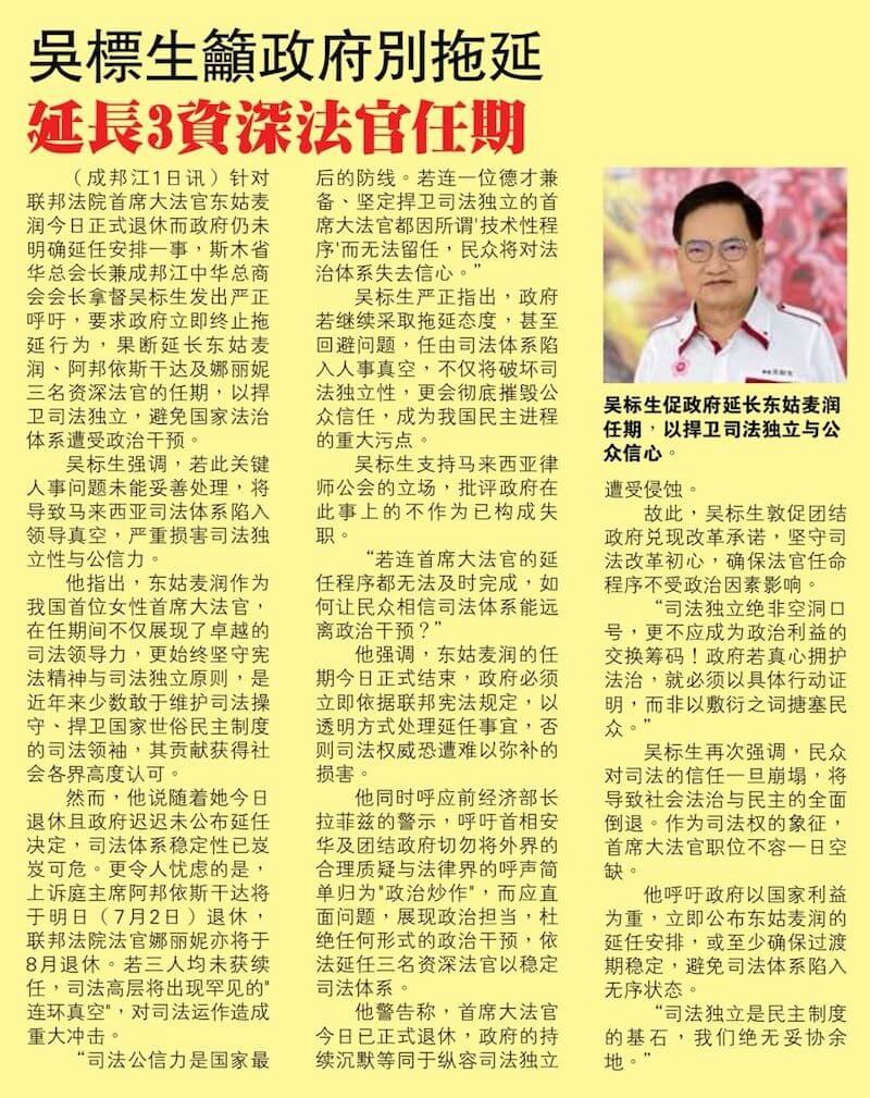 (成邦江讯)针对联邦法院首席大法官东姑麦润今日正式退休而政府仍未明确延任安排一事,斯木省华总会长兼成邦江中华总商会会长拿督吴标生博士发出严正呼吁,要求政府立即终止拖延行为,果断延长东姑麦润、阿邦依斯干达及娜丽妮三名资深法官的任期,以捍卫司法独立,避免国家法治体系遭受政治干预。吴标生强调,若此关键人事问题未能妥善处理,将导致马来西亚司法体系陷入领导真空,严重损害司法独立性与公信力。