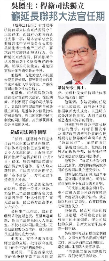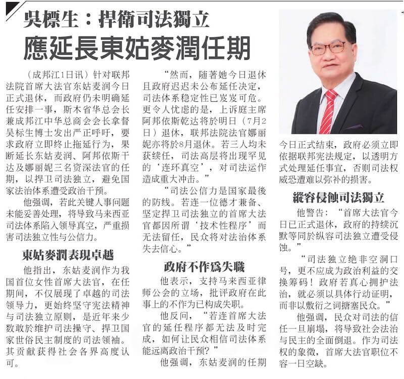 01/07/25 吴标生促政府延长东姑麦润任期 捍卫司法独立与公众信心
